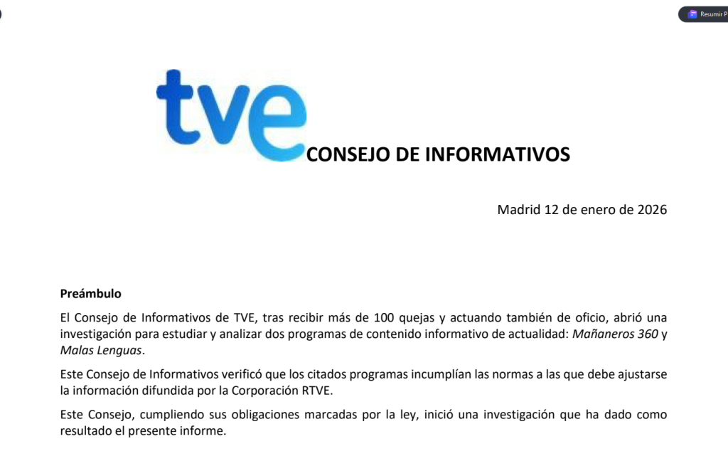 MADRID, 14 de enero de 2026. — El Consejo de Informativos de TVE ha hecho público este miércoles un contundente informe en el que certifica que los espacios de actualidad Mañaneros 360, conducido por Javier Ruiz en La 1, y Malas Lenguas, presentado por Jesús Cintora en La 2, incurrieron en una «manipulación flagrante» al informar sobre el falso hallazgo de una bomba lapa supuestamente destinada a atentar contra el presidente del Gobierno.