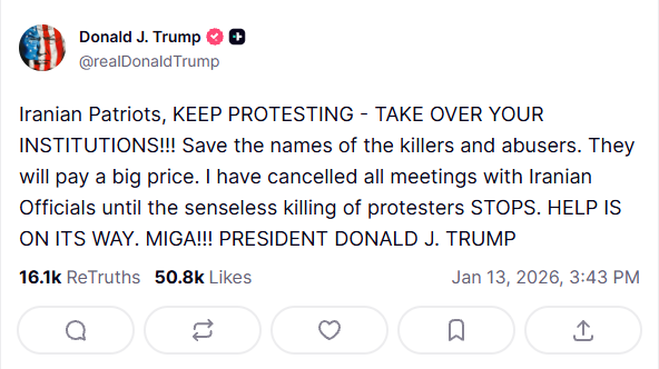 A través de su plataforma Truth Social, el mandatario estadounidense ha lanzado un mensaje que dinamita cualquier puente diplomático restante: «Patriotas iraníes, mantengan las manifestaciones. ¡Tomad vuestras instituciones!». La declaración, que marca una escalada sin precedentes en la retórica de la Casa Blanca, concluye con una promesa tan contundente como ambigua sobre una posible intervención: «La ayuda está en camino».